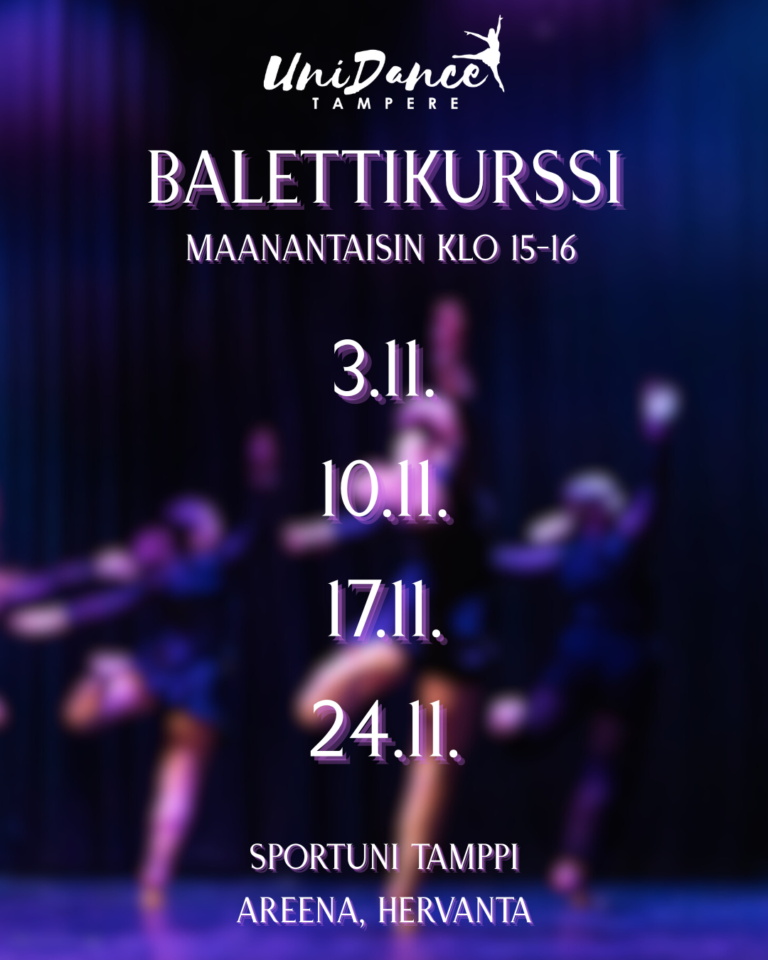 UniDancen syksyn 2025 balettikurssi järjestetään 3.11.-24.11. Kurssin ilmoittautuminen alkaa 20.10. SportUnin nettisivuilla.